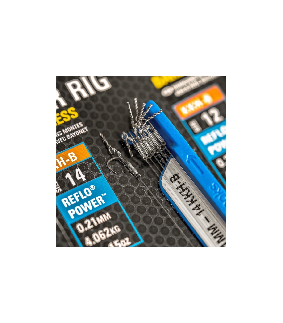 En cada montaje se utilizan anzuelos KKH-B, atados a la mas que probada y testada línea Reflo Power. Los montajes de banda se pueden utilizar para Pellets y Bandums, mientras que los montajes de bayoneta son ideales para Boilie y Bandum hookbaits.