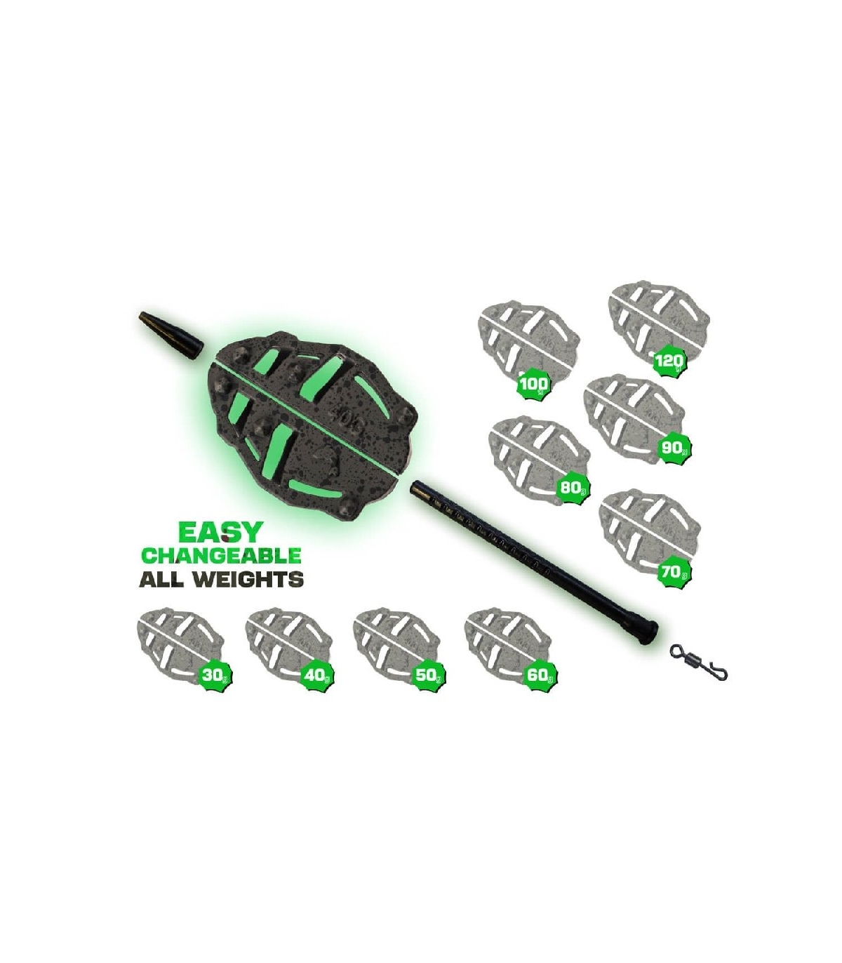 Los alimentadores Spider permiten cambios de peso rápidos gracias al tubo extraíble y a una abertura en la parte posterior. Simplemente deslice el tubo hacia afuera, suelte la línea y reemplace el peso, sin necesidad de volver a atar todo el aparejo.